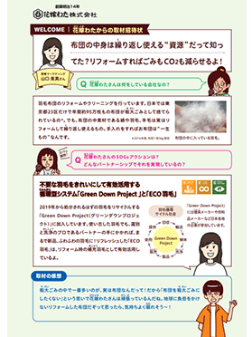 今日までの成長を支えてきた原点は、創業当時から引き継がれた「資源を大切にする」精神と、ものづくりへ貢献してきたからだと考えています。花嫁わたは、布団リフォーム事業で培ったノウハウと、高い品質のモノづくりを実現する技術などの強みを生かし、新たなビジネス領域に挑戦していきたいと思います。企業活動が地球環境に与える影響を認識し、2005年から環境省が策定した環境負担削減のためのガイドライン「エコアクション21」に取り組んでまいりました。